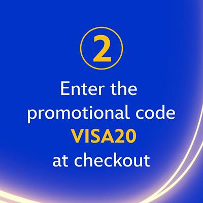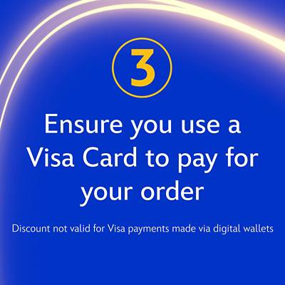 3. 20% discount is reserved for Visa cardholders only and will be applied once the promotional code (VISA20) has been entered at checkout and a valid Visa payment card has been entered. Discount is not valid with Visa payments via digital wallets. Discount will only be applied to items participating in the offer.